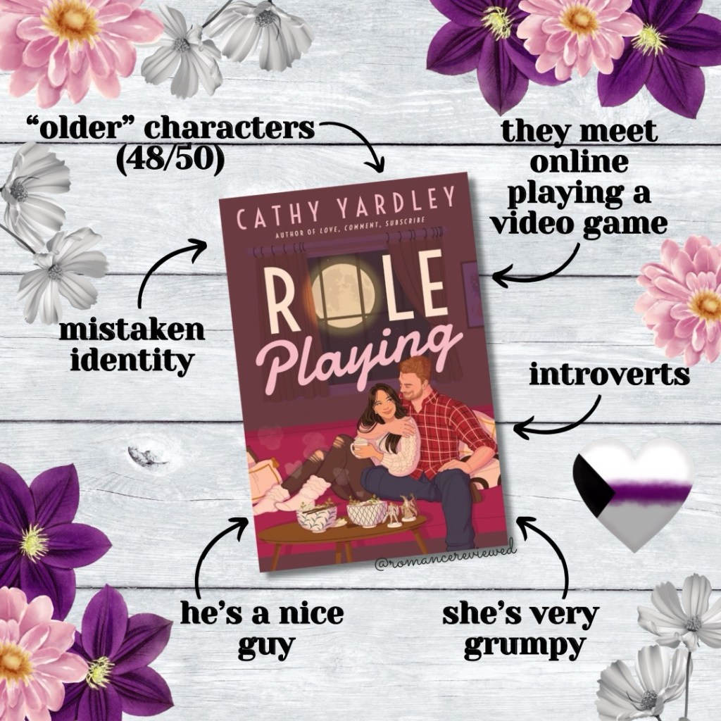 This was a cute romance about two Gen X introverts who meet online while playing a RPG together. Due to assumptions made on each side, they don’t realize they’re talking to someone their own age but they form a friendship regardless while going on quests together with the rest of their guild. Eventually they realize the truth but both are romantically cautious due to their pasts so the friendship continues to grow. I loved Aiden so much. He’s a cinnamon roll good guy who gave up everything to try and take care of his aging parents without much support. He hasn’t had much of a romantic history outside of a few relationships when he was young and I loved the journey he went on to discover why that is (hint: he’s not straight). I love how clearly written and well explored his demisexuality is, a lot of times this is just hinted at or skirted around but it was a major plot point here, integral to his story. Also, he’s described as chunky and PLEASE I am begging you give us more big boy MMCs because I love it. I loved how unapologetically grumpy Maggie was. She was completely out of fucks to give and it was honestly so refreshing to read a character who didn’t care what people thought about her. She was a borderline hermit, leaving her house only when truly necessary and mostly avoiding other people (I can relate). She was also so supportive and accepting of Aiden when not a lot of people in his life were. I really enjoyed this but at times it was a bit too much of a slow burn for me personally because not a lot of tension was being built. Some of the game stuff was also boring for me but I can see that being interesting if you’re into gaming! Overall though I thought it was a good story with great representation and it was a great change of pace to read about characters that skewed older than we normally see in romance! I did the audio on this one, I liked the flow but didn’t think either narrator’s accent was a great fit for the characters. The male narrator especially has a southern twang which didn’t fit the MMC who was born and raised in Washington. This isn’t a huge issue but it is enough to pull me out of the book!